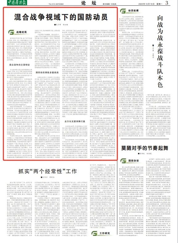 未来混合战争,作战领域全方位扩展,作战力量由传统军事力量拓展到政治、经济、科技、贸易、舆论等非军事力量。打赢未来混合战争,须充分发挥国防动员优势,统筹各条战线,全方位支援保障,快速精敏将战争潜力转化为战争实力。